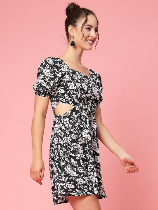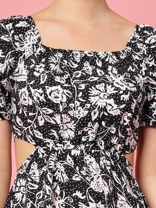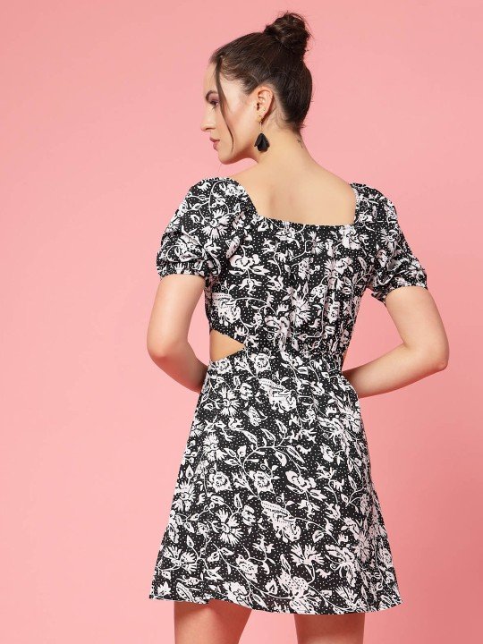 Black & White Floral Printed Puff Sleeve Cut Out Monochrome Fit & Flare Dress