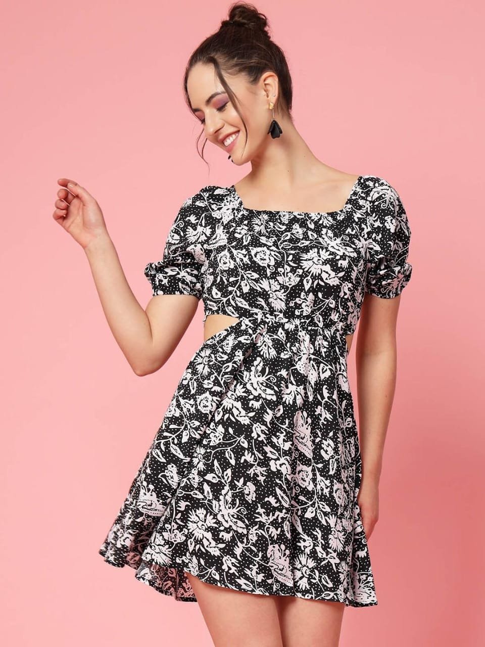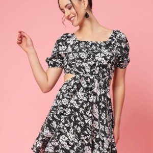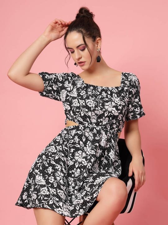 Be the first to review “Black & White Floral Printed Puff Sleeve Cut Out Monochrome Fit & Flare Dress”