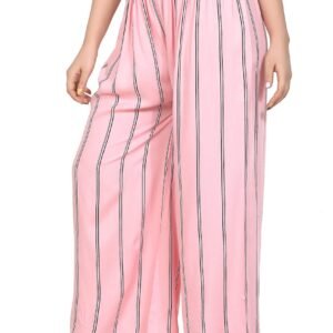 Upgrade your everyday style with this elegant pink striped palazzo pant. Designed with a comfortable elastic waistband, this palazzo offers a relaxed fit that sits perfectly on the waist. The vertical stripe pattern enhances the overall look while giving a taller and slimmer appearance. Crafted from lightweight and breathable fabric, it ensures all-day comfort and smooth fall. The wide-leg silhouette allows easy movement, making it ideal for casual outings, office wear, college, or festive styling. Pair it with crop tops, kurtis, or shirts for a chic and versatile look.
