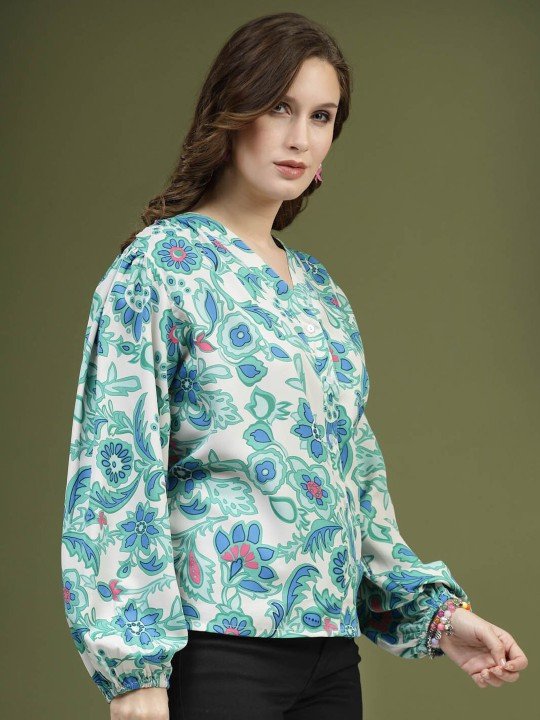 PLUSS Green – White Floral Printed Shirt Style Top