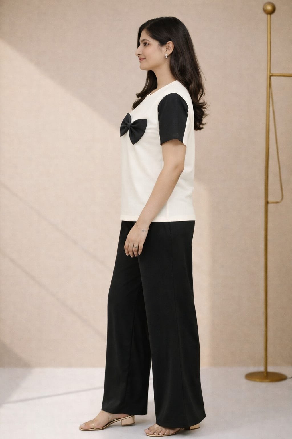 Color: Off-White Top with Black Contrast Sleeves & Black Palazzo
